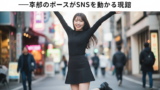 さらに言えば、 彼女は写真だけでなく“動き”にも強い。 歩く瞬間の脚のライン、髪の揺れ、視線の角度── その全部が“オーラ”として伝わる。