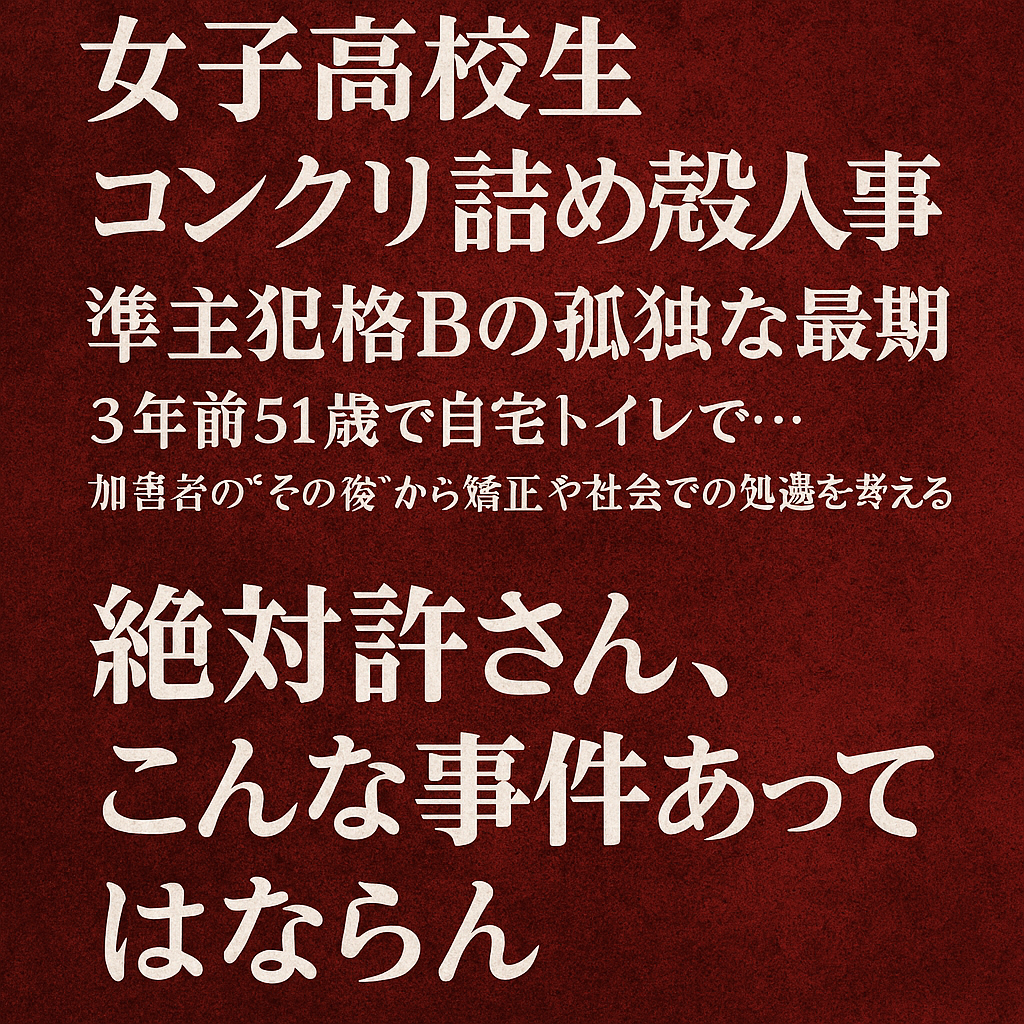 出典:「女子高校生コンクリ詰め殺人事件」準主犯格Bの孤独な最期 3年前51歳で自宅トイレで…加害者の“その後”から矯正や社会での処遇を考える《話題の記事2025》