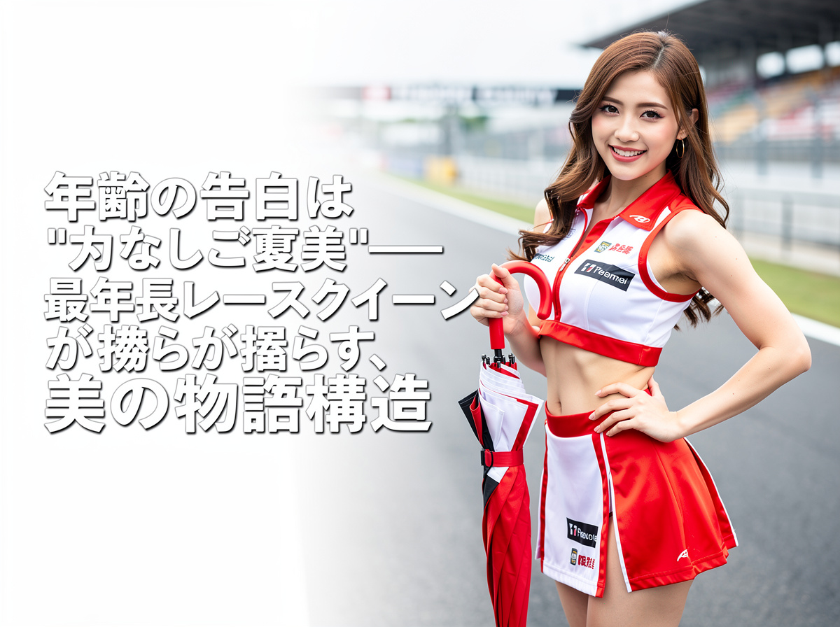 レースクイーンという職業は、見た目が語りの中心に置かれがちだ。 そこに突然、年齢という“裏設定”が明かされると、観客はキャラクターの奥行きを知る。 この“裏設定の開示”は、物語におけるご褒美イベントに近い。
