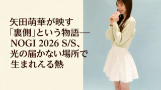 【はじめに】 NOGI 2026 S/S の撮影裏側動画が公開され、SNSは静かな熱で満ちている。表舞台の“完成された美”とは別に、裏側には揺れや迷い、準備の呼吸が映り込み、それがファンの心を強く引き寄せる。矢田萌華という存在が、その“裏...