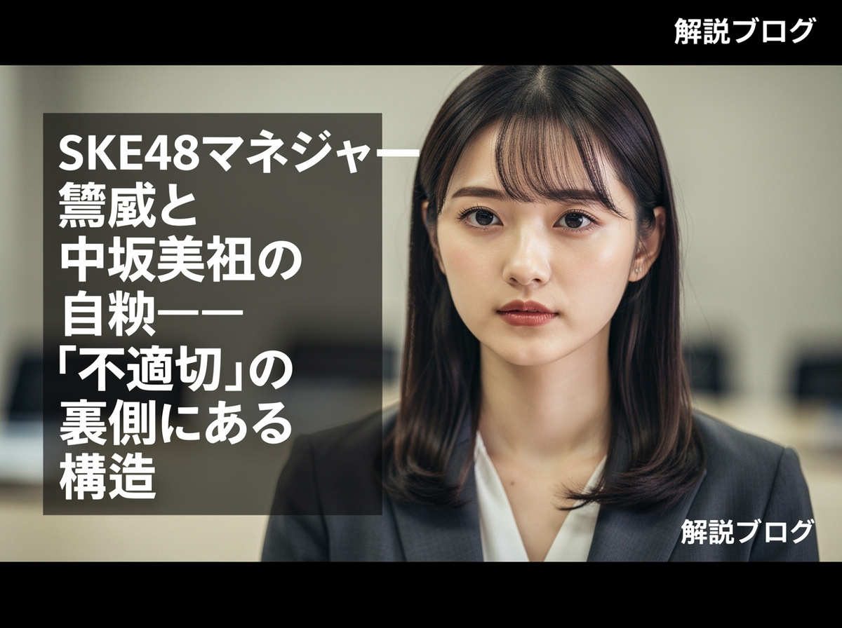 SKE48・中坂美祐の「活動自粛」と、担当マネジャーの「懲戒処分」。 公式文書には「業務の範疇を超える連絡」「不適切と受け取られかねないやり取り・行動」、そして「信頼を著しく損ねる事態」というフレーズが並ぶ。 ただ、事実列挙だけでは、ファンのざわつきも、SNSの分断も、あまり説明できない。 この出来事を「一人のタレントと一人のマネジャーの問題」としてではなく、「構造の物語」として見直してみたい。